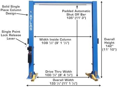 DURABLE SINGLE-PIECE COLUMNS: The lift’s single-piece 11′ 10″ formed columns and extra-long carriages are engineered for maximum strength and stability, ensuring many years of reliable and trouble-free operation.