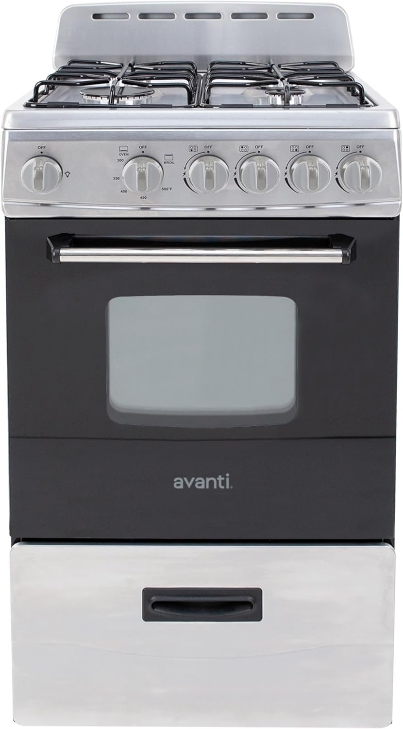 The Avanti 20-Inch Gas Range Oven is the ultimate space-saving solution for small kitchens, studio apartments, RVs, and vacation homes. Designed with efficiency and style in mind, this compact freestanding gas range features 4 sealed burners (1 rapid, 2 semi-rapid, and 1 simmer) with electronic ignition for precise and consistent cooking. The 2.1 cu. ft. oven offers ample space with two racks and includes a broiler with a broiling pan, making it perfect for baking, roasting, and broiling. Additional features such as a seamless framed glass oven door, 60-minute timer, oven light, and a storage drawer ensure convenience and functionality. With an LP conversion kit, ADA-compliant design, and integrated backsplash with oven vents, this gas range is versatile, practical, and perfect for any small kitchen setup.