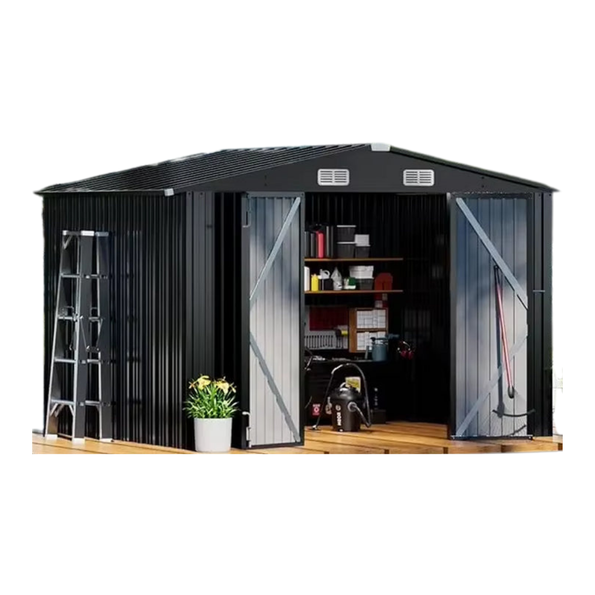 - Optimal Ventilation: Equipped with air vents, this steel shed promotes air circulation, reducing moisture buildup and preventing the development of odors inside.